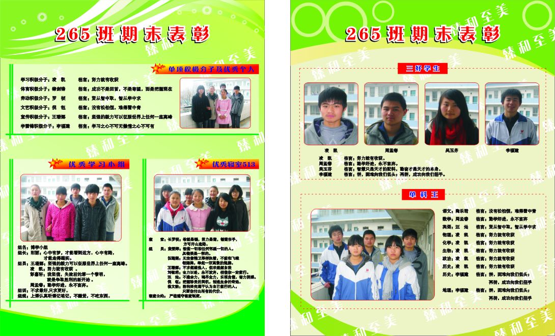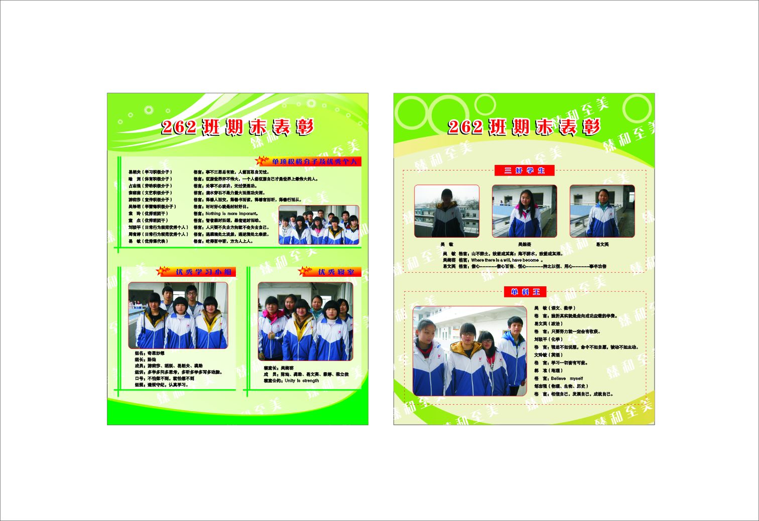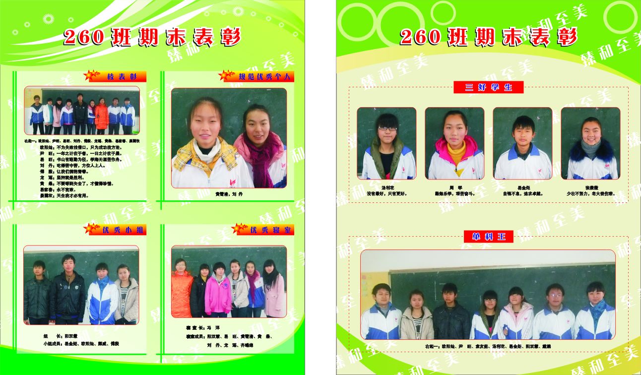 新的学期开始了,为表扬先进,激发同学们在新的学期里潜能,增强同学们的信心,级部把去年下学期同学们获得的各项奖励,如:学校示范班级,学校优秀班级,学校三好学生标兵,学校三好学生,学校优秀干部,学习成绩前十强,各项积极分子等绘制成图,以光荣榜的形式张贴在学校的显眼处,以资鼓励,希望同学们再接再厉,再创辉煌.