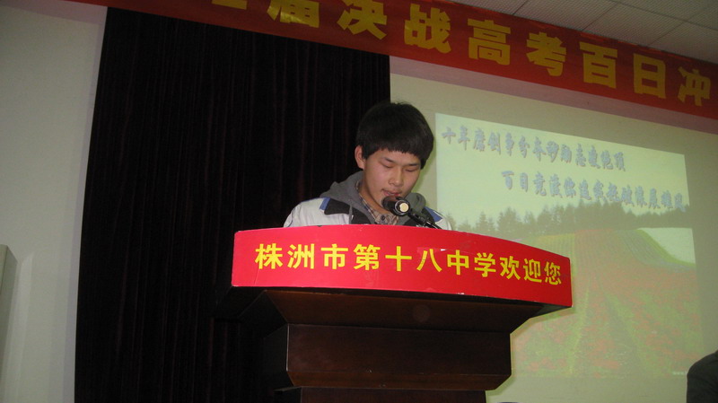 高三223班班主任彭咏莲老师代表毕业班教师郑重表示:为了同学们高考的成功和十八中高考的辉煌,全体高三教师将和所有学生一起,苦战100天,与同学们同甘共苦,同心同德,成为同学们冲刺途中坚定的引路者和保障者。她的发言慷慨激昂,号召全体高三师生全力以赴、团结奋进,以坚持不懈、矢志不渝的精神去创造高考新辉煌,谱写十八中新篇章。