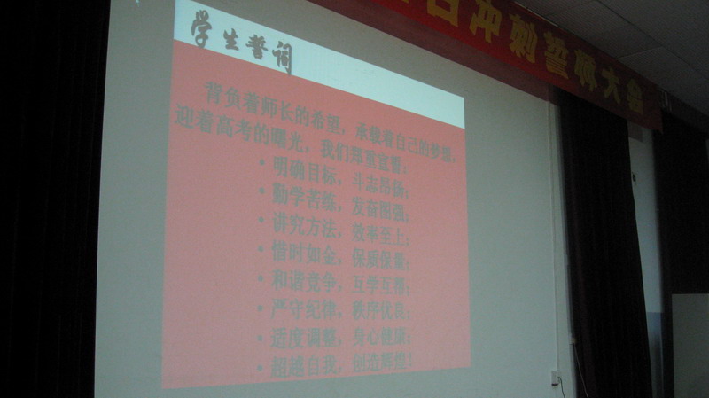 严冬已逝,春意渐浓。2012年2月28日下午,我校阶梯教室里激情澎湃,气氛热烈,为鼓舞我校高三专业生的士气和进一步激励高三师生的拼搏精神,高三级部在这里隆重召开了2012年“迎高考百日誓师大会”,这标志着我校高三全体师生吹响了全力冲刺2012年高考的战斗号角!