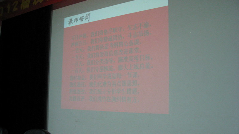 最后在座所有的高三教师宣誓,一百天,可以收获累累;一百天,可以突飞猛进;一百天,可以创造奇迹;一百天,可以改变命运。我们全力以赴,并肩作战。相信通过最后一百天的努力,2012我校高考一定会取得更加辉煌的成绩!