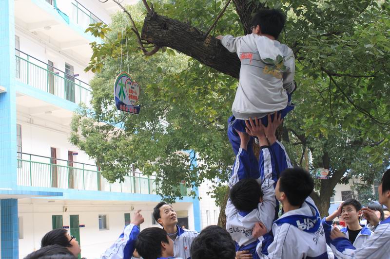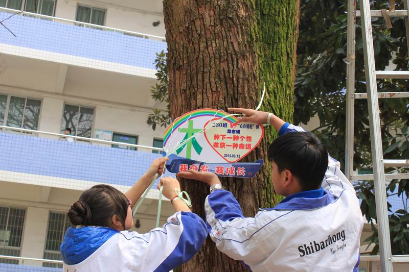 久违的太阳,照艳了十八中的天空,也照彻学生奋发的脸。学生对认领的树进行分班挂牌仪式,各班树牌像旗帜一样冉冉升起,像春天开放的花儿一样艳丽。学生或整齐的排好队伍在班树下庄严宣誓;或围绕班树许下共同的愿望;或盘坐在班树下唱歌跳舞;或写好愿望埋在树底下;或手系各色丝带,注目班树,讲讲心里的话;或在班树下写下班级诗篇,用漂瓶系好在树上;或邀请领导老师在树下常谈理想;或在树下进行才艺表演……,形式多样,不拘一格。为学校的树木文化开了先河,丰富了校园精神生活,同时更加丰富了学校的校园文化。