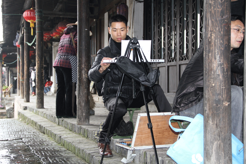 在一个条件简陋的宾馆安顿好后,我们不顾一身疲惫,就投入了西塘古镇核心景区的怀抱。上午任务是“踩点”,选好适合写生的地点。西塘古镇确实名不虚传,江南特色民居古建筑保存完好,斑驳的大理石街面,白墙灰瓦,小桥流水,小红灯笼高高挂,仿佛带我们进入了一个遥远的时代。