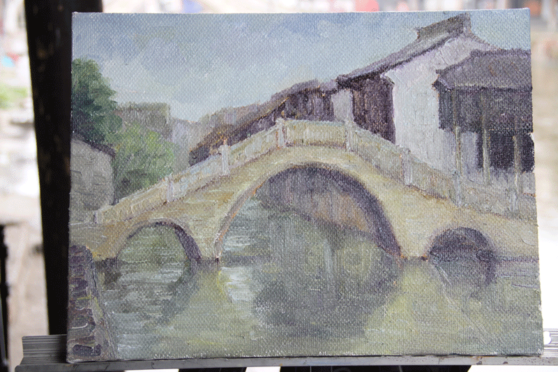 中餐口味一般,带的湖南萝卜辣椒一扫而光。上午还是阴天,下午就刮风下雨,寒气逼人,我们有点后悔没穿得棉袄。当然,这也挡不住我们对西塘古镇的爱恋之情,备好画具颜料,带上雨伞,直奔选好的写生地点。我们在烟雨长廊边架起画具,开始了“西塘处女作”。灰蓝色的天空、斑斓的小河、古朴的石拱桥、岸边林立的民居、刚透点绿的零星树木,一幅冷色调的烟雨迷蒙的江南风景呈现在眼前。三个多小时一晃而过,饱经风雨的我们一个个冷得直打哆嗦,鼻涕直流。好久没有外出风景写生,技艺略显生疏,看着不太成熟的“处女作”,虽腰有点酸,腿有点疼,心里还是略感满足。