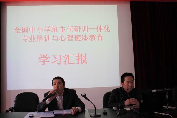 前不久,我校委派罗志强、刘建红、江孝平、何志文四位班主任去长沙参加了“全国中小学班主任研训一体化专业培训与心理健康教育”会议,四位老师认真听会,与参会人员密切交流,也向专家请教困惑的问题。学习归来后,当即将各自的反思收获与主管德育的欧林奇副校长和学生科饶鹤龄科长进行汇报交流。今天,由骨干班主任罗志强老师作为代表在全体班主任例会上做了分享。