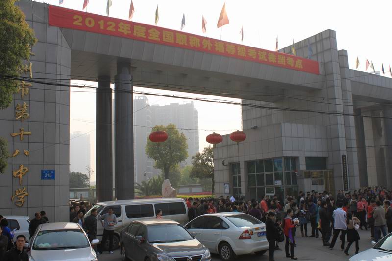 2012年4月7日上午9点到11点30分,2012年度全国职称外语等级考试株洲考生在市十八中考试。十八中在上级领导下认真组考,安排好各种考务工作,监考人员负责认真细致。考试秩序井然。考试完后,很多的考生特意参观十八中美丽的校园,并对十八中的校园文化建设赞不绝口。
