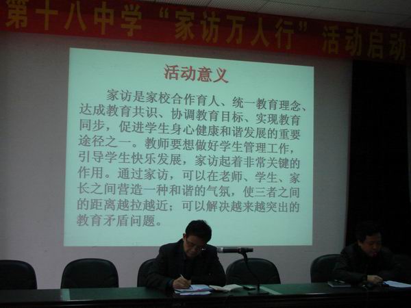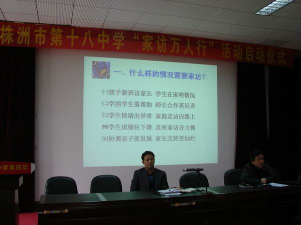 4月16号下午第八九节课,株洲市第十八中学“家访万人行”活动启动仪式举行。活动得到了领导的高度重视,李国柱校长主持,主管德育的欧林其副校长精心准备,担任主讲,全体教职员工热情参会。