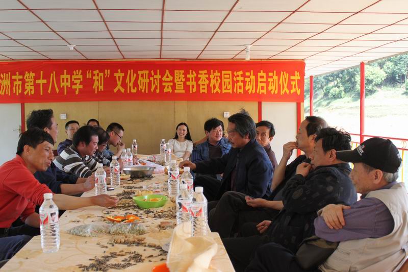 在上午聂鑫森等一行兴致勃勃参观十八中美丽的校园以及特色教育的模块功能室,随后听取李国柱校长对十八中“和”文化的畅谈和彭泽波主席对十八中校园文化的阐述。这些专家学者对十八中的校园环境赞不绝口,并对十八中的文化理念和特色办学理念给予高度评价。下午这些专家学者与学校领导老师在青山绿水中畅谈“和”文化以及“书香校园”的积极意义。个个神清气爽,人人思想丰富而深邃,气氛快乐和谐,为十八中的“和”文化和书香校园注入泠泠活水,丰富十八中“和”文化的内涵,十八中的文化如春天里生命一样,在春和景明中接受润泽,在惠风和畅中翕动,在天朗气清中成长,在万紫千红中张扬。