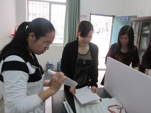 老师们在装订试卷