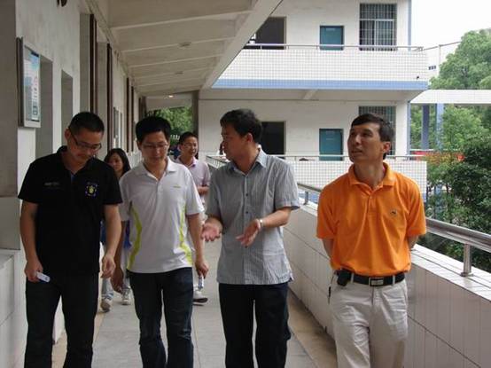 图为主管德育的欧林其副校长和工会彭泽波主席在听学生介绍设计寓意