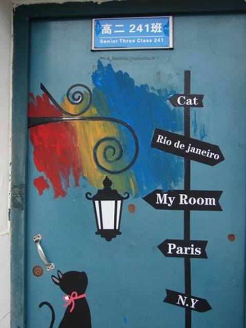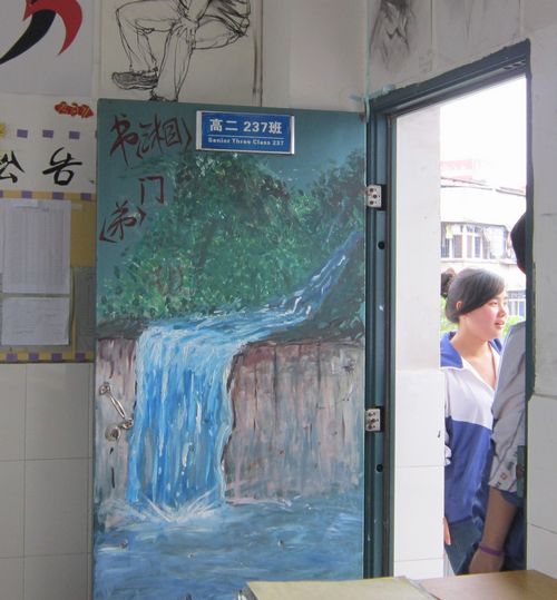 高二237班教室门上,一幅山水画,上书“书湘门弟”,学生介绍说“湘”指的是班主任张建湘老师,“弟”则是张老师的三十个弟子,有创意有寓意吧!