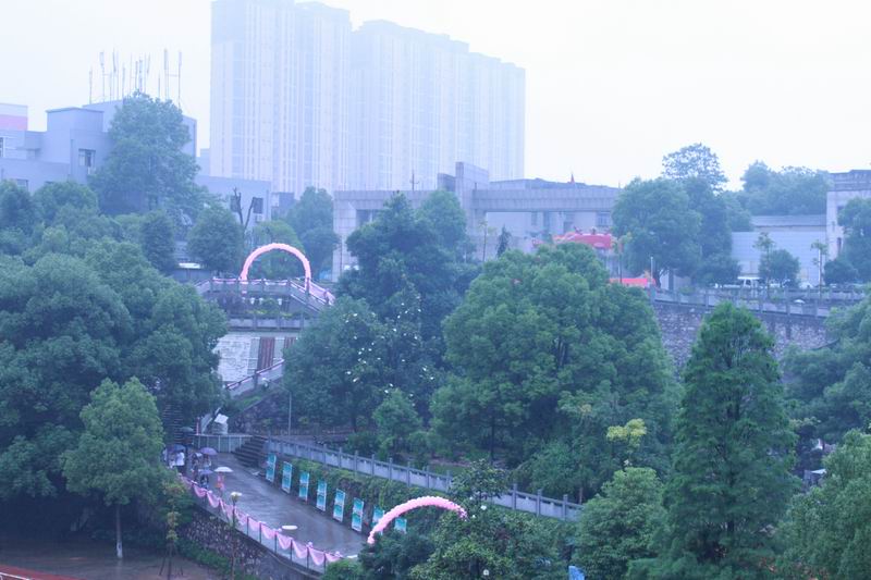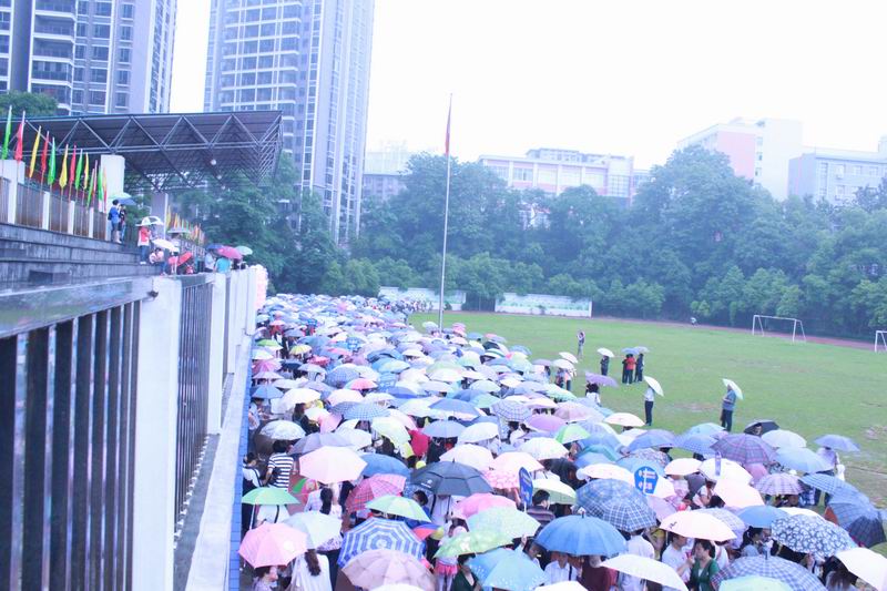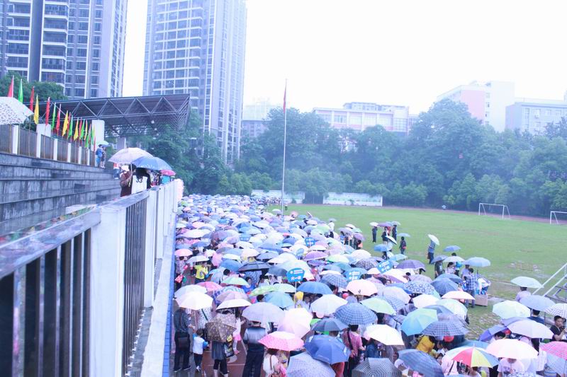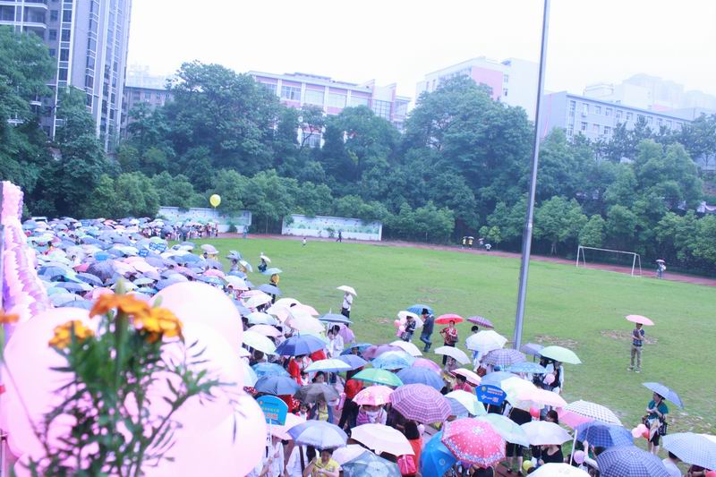 是日,夏雨倾盆,并没有淋湿孩子、老师、家长的热情,真可谓“雨中情真,伞下意切”漫天飞舞的气球,遮天斑斓的雨伞,活泼绚烂的彩旗,和着这菲菲的雨,一个童话般的盛典哗然走来。孩子们穿上节日盛装,在摩肩接踵的家长蔽日的伞下快乐的笑着跳着,大有仗彩笔走天涯的俊朗之气,更有少年英雄华山论剑的风范。