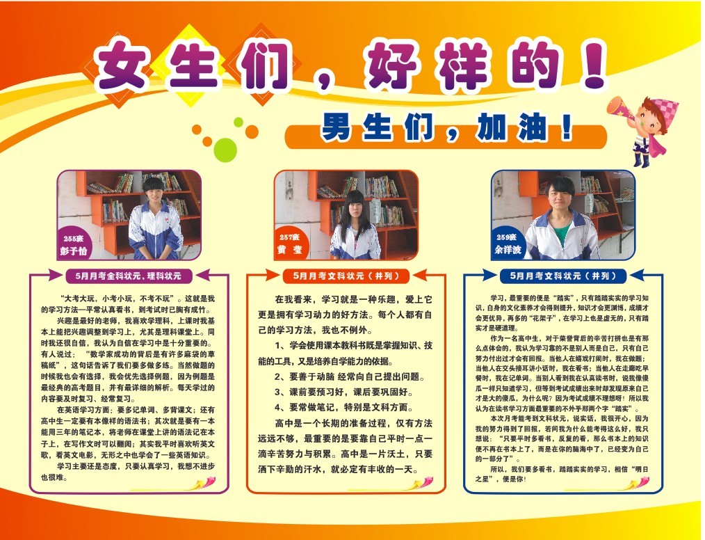 在高一级部的5月份月考中,文理状元均为女生,真是阴盛阳衰, 男生们要加油呀!其中理科状元是255班的彭予怡,文科状元是257班黄莹(并列)、259班余阳波(并列)。