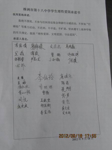 为了教育学生理性爱国、文明爱国、守法爱国,周二下午第九节课,高一各班举行主题班会。同学们在班会上庄严宣誓:理性爱国!并在承诺书上郑重签字。