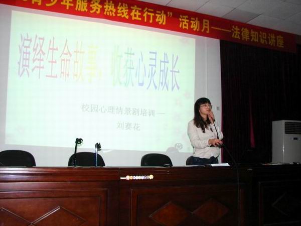 此次培训活动由阳光心理社社长谢娟和心理剧组文许恒同学主持,各班班长、团支书、各参赛队、阳光心理社全体成员参加了活动。市名师工作室主持人,心理中心顾问刘立红老师到场指导。