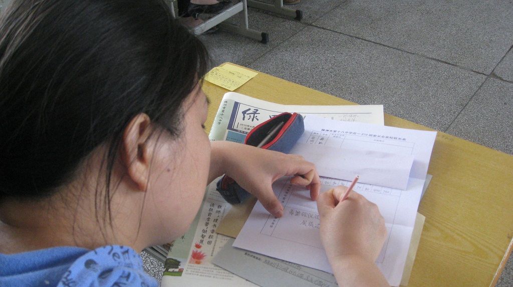 274班,桌上摆上了学生自己的书法作品。