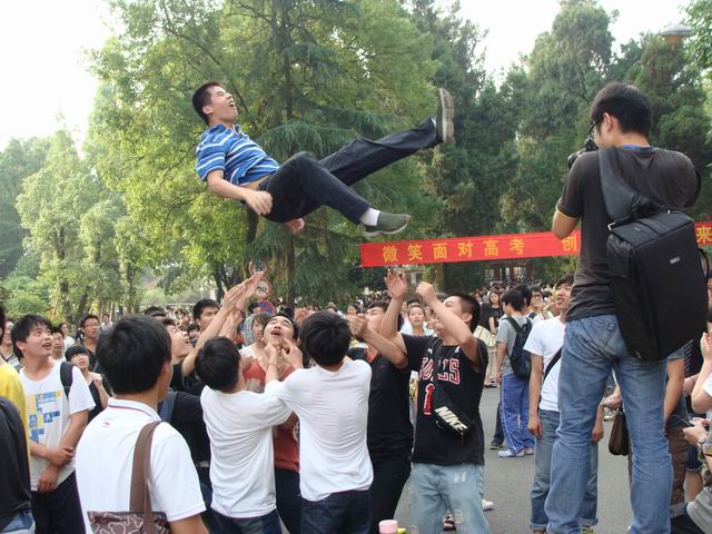 高考胜利结束,考生们兴奋地将同学抛向空中