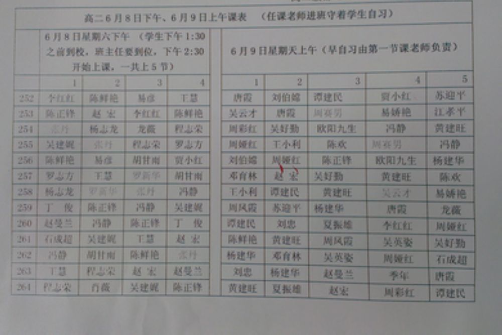 (3)晚自习所有的语文、化学、政治老师值班,老师们根据自己的情况进教室辅导,级部不将老师具体分配到特定的班级,请老师们必须进教室去或在教室外个别辅导,不能呆在办公室;
