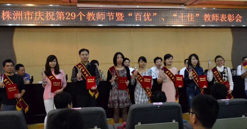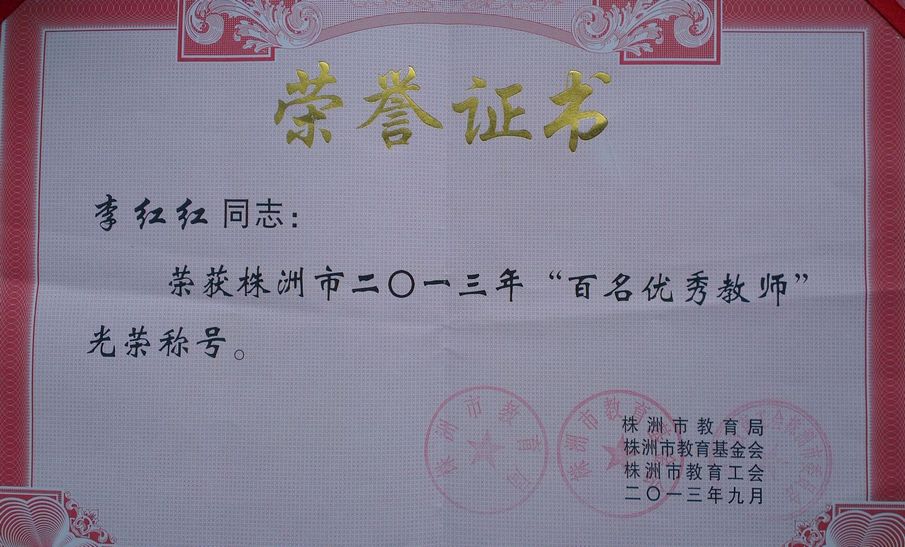株洲市庆祝第29个教师节既“百优”、“十佳”教师表彰会于今日上午(2013年9月6日)在教育局四楼会议室隆重举行,我校高三级部级部长李红红老师榜上有名。
