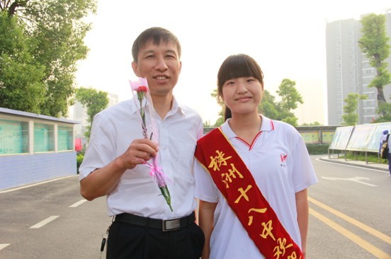 这时她才回过神来,抬头看见两龙腾飞的气拱门上赫然印着“热烈庆祝第二十九个教师节”的金光大字,与朝阳齐飞,与巍峨的校门辉映,两旁站立整齐身着校服身披“株洲市第十八中学”绶带的学生每人手捧鲜花和一个红红的小礼品盒。