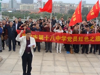 整个活动,安排紧凑,按部就班,有条不紊的开展。支部党员一切行动听指挥,展示了十八中党组织强大的凝聚力。支部红旗随风飘扬,似一片片红云指引方向。全体党员都积极参与,热情很高,红旗指向哪里,队伍就走向哪里,党员就跟在哪里。特别是彭咏莲、刘向东等同志不顾自身的病痛,忍受着晕车的煎熬,坚持全程参加,以虔诚之心接受心灵的洗礼。大家都纷纷表示要以此次教育活动为契机,进一步加强自我锤炼,秉承先烈遗志,全身心投入党的教育事业,为学校发展和学生成长,忘我奉献,不懈奋斗。