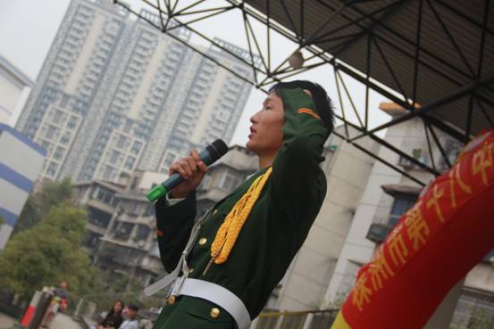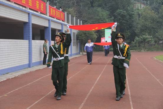 在庄严的升旗仪式上,学校领导、老师、学生共唱《义勇军进行曲》,爱国主义教育无处不在、无时不在。