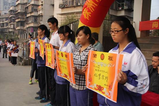 获得优秀方阵奖的班级有:高一鲜花方阵、高二彩旗方阵、281班、283班、284班、285班、291班、1406班、1409班、高三美院班