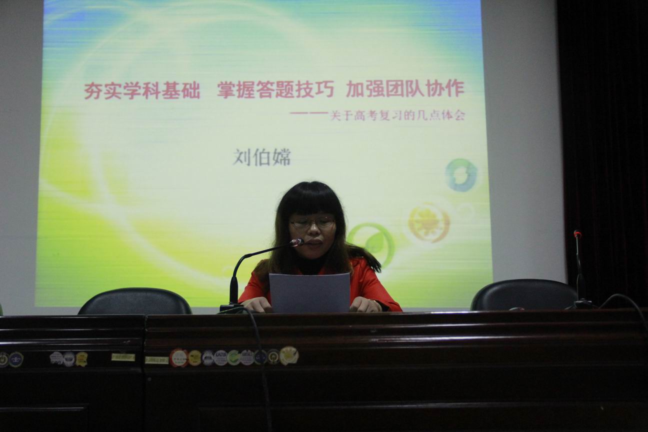 随后,语文刘伯嫦老师代表高三级部做了经验交流。刘老师2014年高考中,所带256班语文高考取得平均分99.18分的好成绩。她总结的经验主要是在平时的教学中要加强对学生语文素养的培养和学生答题技巧的指导,让学生自己学会感悟生活,潜移默化中提高自己的语文成绩。