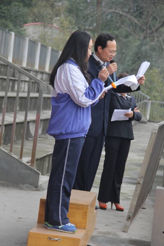 高三级部长文新岳部长发言,他身着笔挺的西装,气质潇洒,他的闪亮登场引来学生阵阵掌声,“过去我们取得过优异的成绩,15年我们会有更高质量的辉煌,同学们有没有信心”,“有”,整齐响亮的回答引爆全场,师生共唱“天有多高,心有多高,敢于挑战,再比高”,歌声振奋人心,久久回荡在每一个人的心里。一向幽默诙谐的文部长在学生中获得颇高的人气指数,今天他一改往日的风格,与我校传媒学生余素同学深情合诵了一首诗,