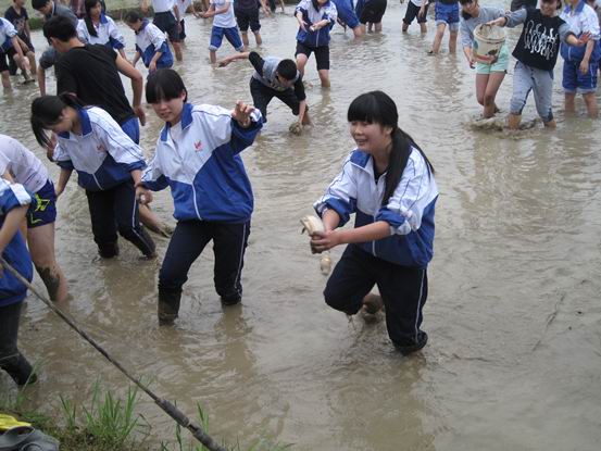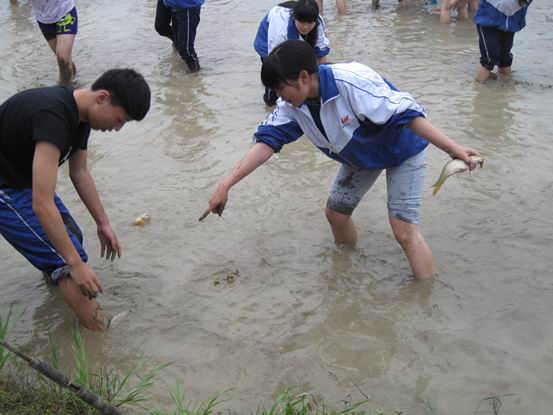 因为还在下着小雨,水很凉,首先下去的是一些男同学。他们卷起裤脚就往水田中间冲去,在他们的带领下,慢慢的下去抓鱼的同学越来越多。