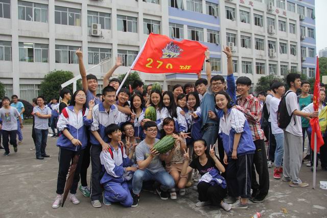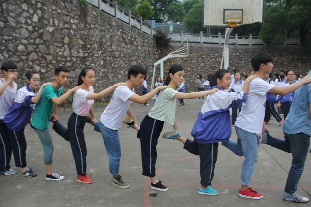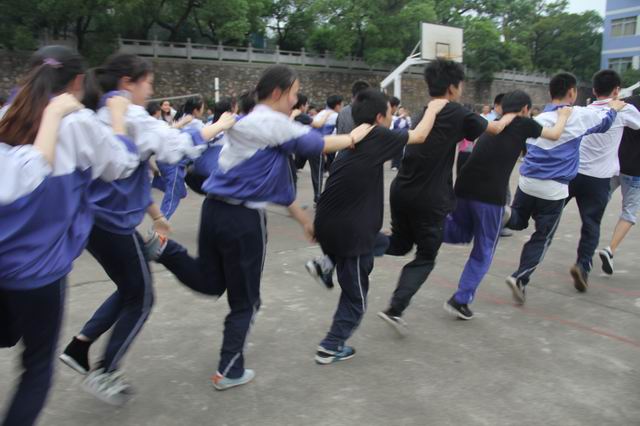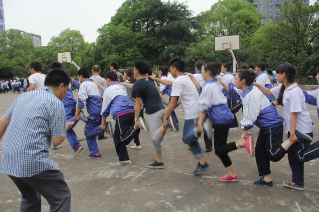 5月29日下午,高二年级在田径场热闹的开展“无敌风火轮”竞赛。在校篮球场,高三年级的孩子们正非常起劲的玩着心理减压拓展游戏。高三级部长文新岳老师亲自指挥,副级部长杨飞雪老师带领级部老师负责组织,各班班主任带队,“珠行万里”、“成功穿越”、“小火车赛”三个小游戏相继开赛。
