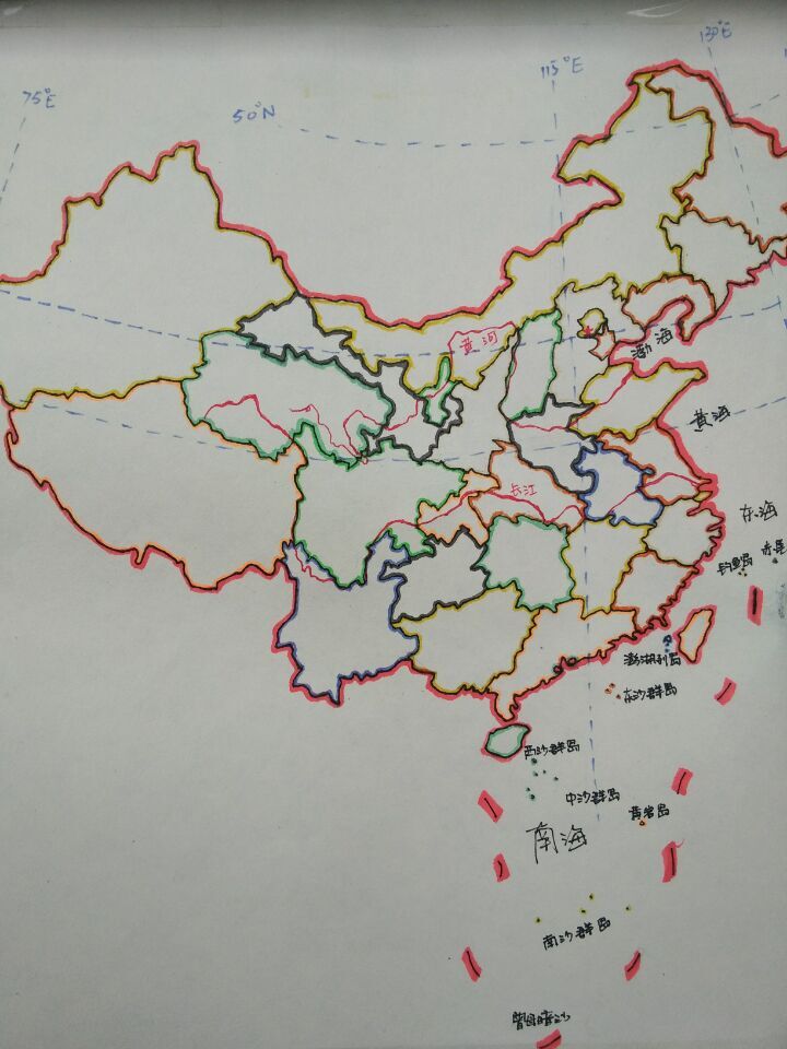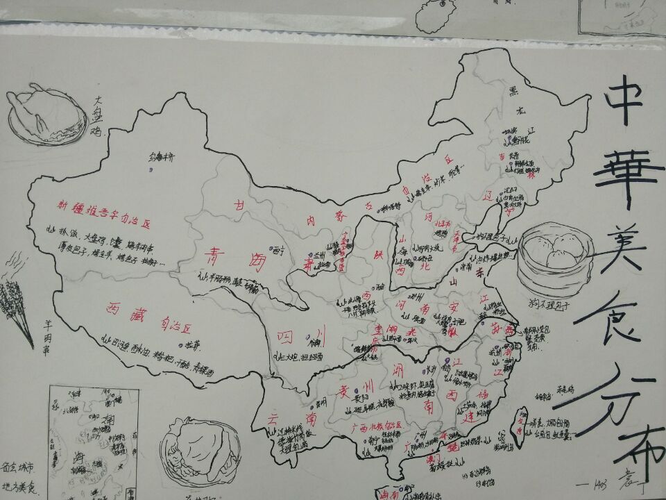 地图是地理的语言。高一年级备课组为丰富学生的课余文化生活,学以致用地举行了“中国地图”绘制比赛。虽然各位同学都是初次接触地图绘制,但是其水平不亚于专业的绘制。同学们凭借着自己对祖国的认识绘制出了一幅幅个性化的地图,其中不乏有比例精确、精美绝伦的、内涵丰富的、风趣幽默的地图。