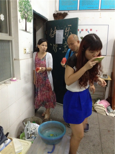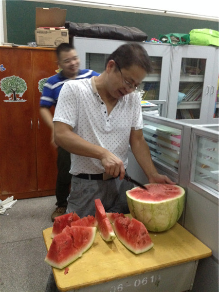副级部长杨铁军同志亲自操刀,剖西瓜。美女也顾不上形象了!