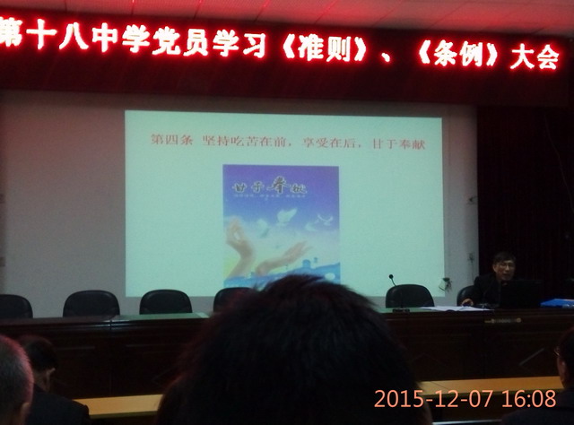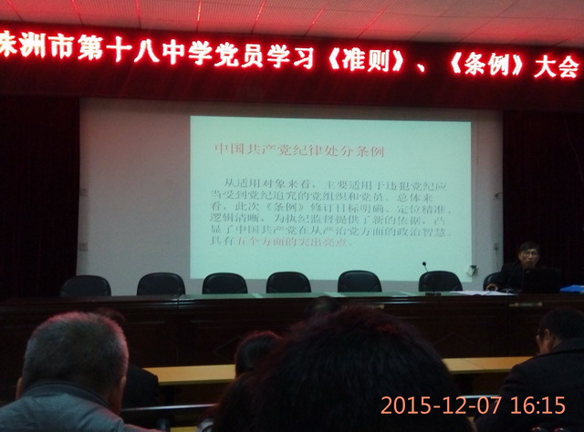 2015年12月7日下午,株洲市十八中党委组织全体党员专题学习新修订的《中国共产党廉洁自律准则》和《中国共产党纪律处分条例》,拉开了学习《准则》和《条例》序幕。