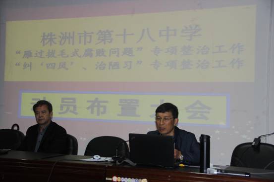 杨书记在会上首先认真的解释了“雁过拔毛”式腐败与“纠四风、治陋习”的含义,针对这两个问题给老师们传达了中央党委、省委、市委、局党委的重要精神;然后根据上级部门的精神指示,明确两大专项政治工作的重点整治问题与主要任务;最后向全体教职员工通报中央、我省、我市在这两大专项整治问题上出现的典型案例。其目的不仅仅是让同志们了解,更重要的是在自己的工作生活中时刻引以为戒,做一名政治上合格的人民教师。