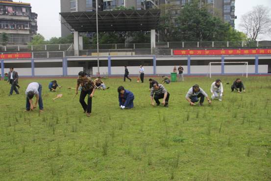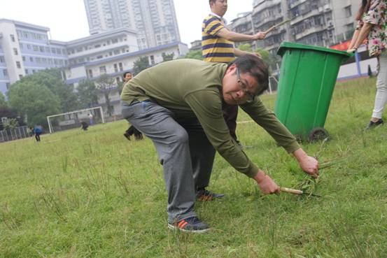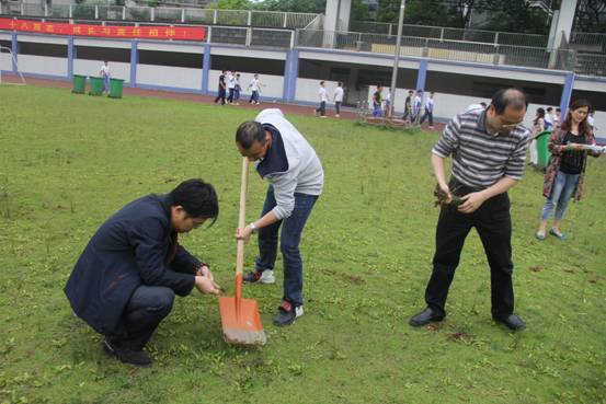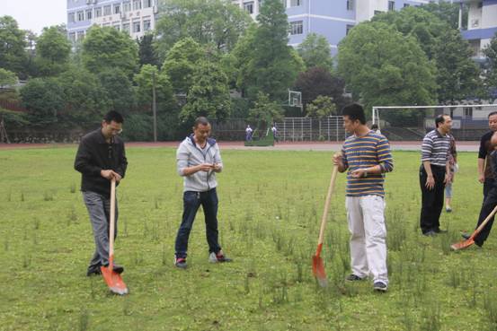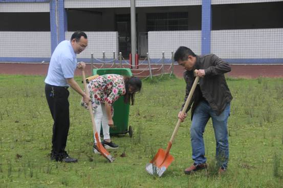 5月23日第八节课,为了给学生一个更加舒适的运动场所,党委书记杨电波同志、校长李国柱同志带领行政支部、高一支部全体党员教师参加操场清草义务劳动。第七节课一下课,党员教师们就扛着铁铲、手拿镰刀、拖着垃圾桶来到足球场,热火朝天的干了起来!