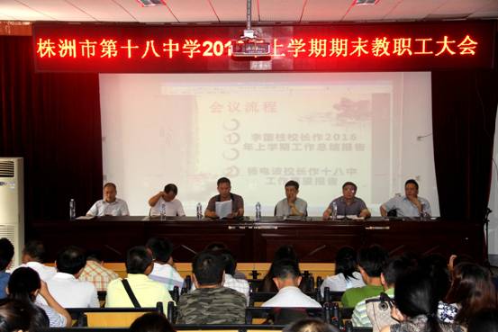 7月8日上午10点,十八中全体教职员工齐聚一堂参加2016年上学期期末教职工大会。每一位教职员工脸上都洋溢着幸福,因为今年对于我校而言又是一个丰收年。高考我校一次性二本及以上上线人数达到165人,最后录取预计会突破270人;学考合格率达到99%以上;更重要的是每一位教职员工都对学校今后的发展充满的期待。会议由彭仁堃副校长主持,大会主要内容是李国柱校长作2016年上学期工作总结、杨电波校长做十八中工作展望。