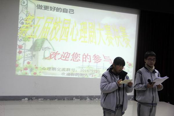 阳光心理社社干1614邹萱(左)与1608罗祎庭担任主持人