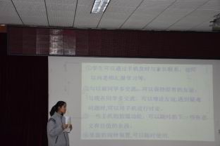 12月28号第八节课,1604班主题班会“手机那些事儿”在学校多媒体教室举行。这次主题班会由王慧,曾良芬和陈慧芳三位年轻老师精心策划,全程学生主持。学生通过观看自主编演的手机情景剧,感悟手机对生活、学习的影响,通过小组讨论、自由辩论等方式深化对手机利弊的认识,现场还播放了家长对孩子们使用手机态度的视频,不少同学认为,手机为生活、学习提供了便利,但使用手机需要一定的自控力。班会环环相扣,层层推进,最后,同学们制定了君子协定:“我是十八中人!我是1604的一份子!我愿遵守校纪班规,立校园现代绅士淑女之品!”。班会即将结束,班主任陈慧芳老师适时进行了简要的精彩总结。