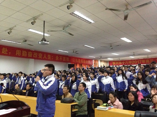 3月10日下午,春风骀荡,春意融融。十八中学校领导、高三级部全体师生齐聚于学校阶梯教室,隆重召开2017届高三高考冲刺誓师大会。会议由级部江孝平副部长主持。