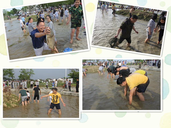 开营仪式后,全体同学回农户家安顿好行李,换好衣服,相继赶到鱼塘边抓鱼啦!男生脱下上衣,长裤,猛地跳下水,女生卷起裤腿,挽起衣袖,小心翼翼的紧随后面。抓到鱼的欢呼声一片接一片,越来越多的同学按捺不住,加入了抓鱼大军,老师们也跳入水中,和同学们一起抓鱼。有的单独作战,居然也可以一抓一个准,据说,1609班一位男生抓了近20条,更多是集体围剿,或者排成一排扫荡,或者围成一个圆圈;还有的同学在池塘远端玩起了泥巴仗,在泥地里翻滚嬉戏,High翻天!这是一个快乐的下午。岸上围观也是乐趣多多。
