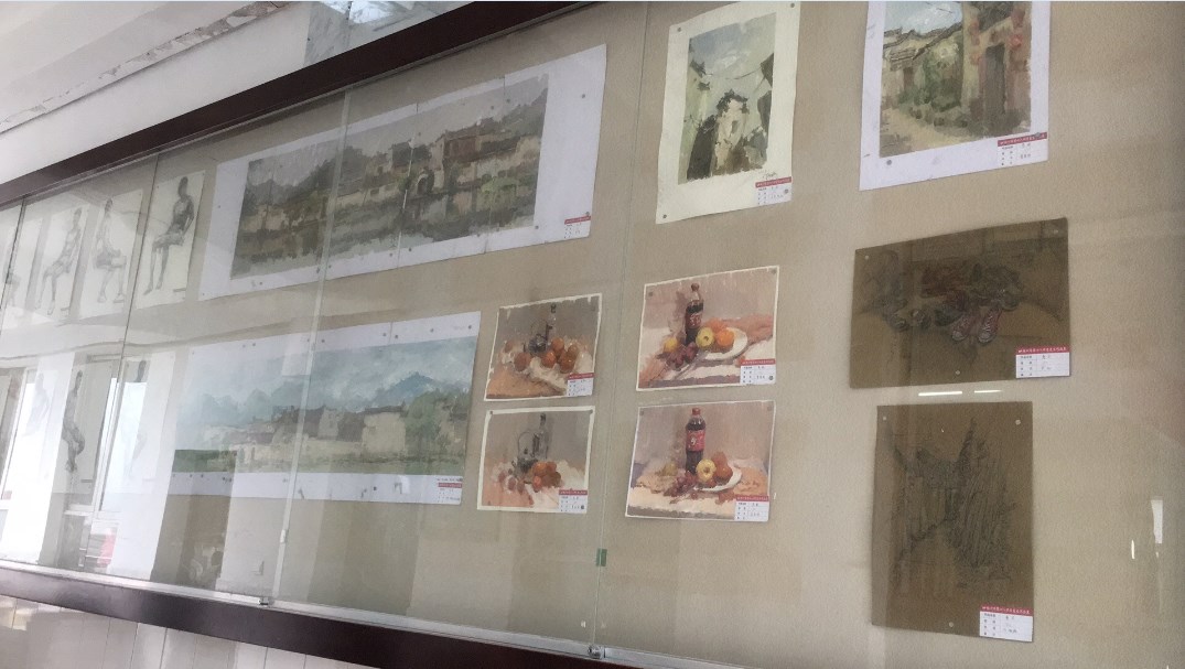 教学楼二楼至六楼的橱窗展示了2017届专业生及2018届专业生的优秀作品。作品内容涵盖:“向大师学习”“杭州集训人体、风景、人物肖像优秀作业”、“场景素描、场景色彩”、“2017届毕业优秀作品选集”四大主题。5个橱窗的布置皆由现高三专业教师整理布展。以袁旭老师、林子老师为首的高三团队8月28日才从长沙集训归来,29日便投入了紧张的选画布展阶段,9月2日便使橱窗焕然一新,用最高的效率完成了工作。
