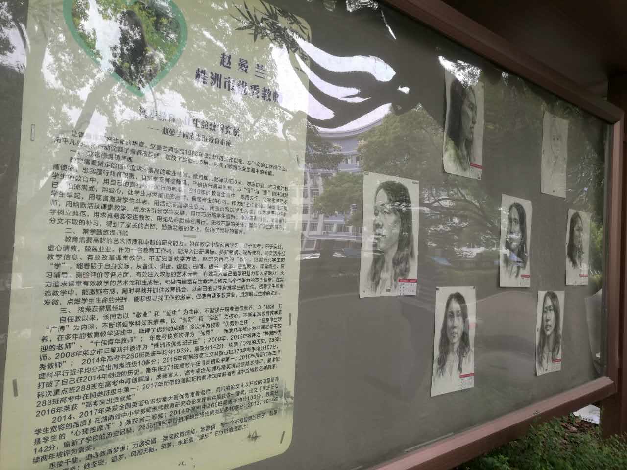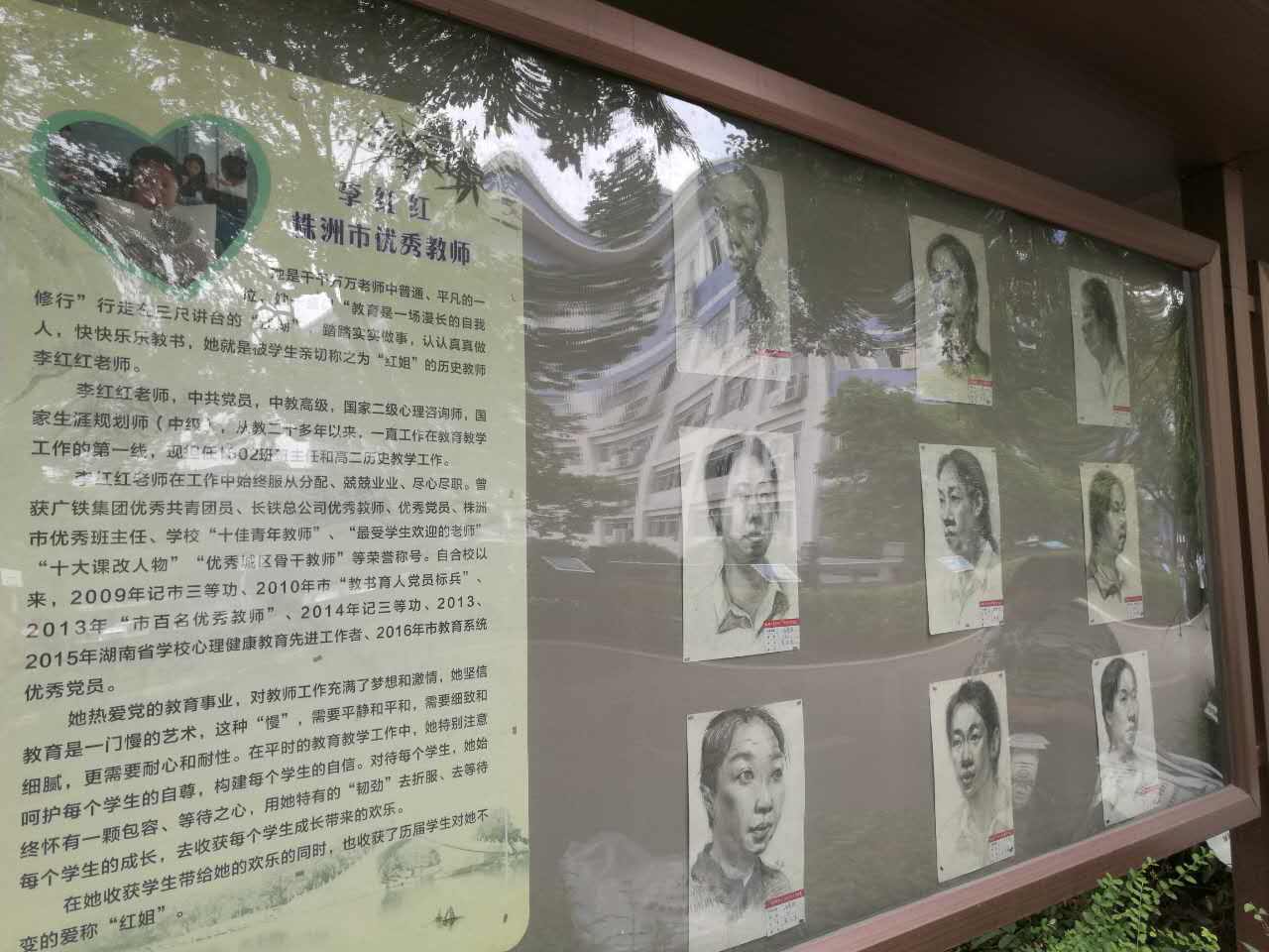 适逢教师节,校道旁的橱窗,则以十八中学子特有的方式,向我校历年荣获“市级优秀教师”的九位老师致以了崇高的敬意——为优秀教师画像。该活动7月启动,暑假期间,赵曼兰、文新岳、贾小红、饶鹤龄、李红红、唐玲、罗志强、周娅红、刘云华9位老师来到画室作模特,由学生们一笔一划画出了心目中最美的样子。