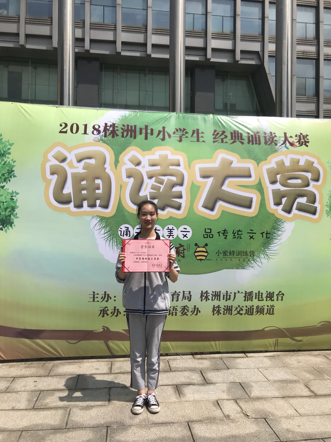 五月六日,由株洲市教育局、株洲市广播电视台主办,株洲市语委办、株洲交通频道承办的2017株洲中小学生经典诵读大赛颁奖典礼在株洲传媒大厦举行。由安瑛老师、张旸怡雪老师带领的株洲十八中团队杀入决赛,获得团体三等奖。
