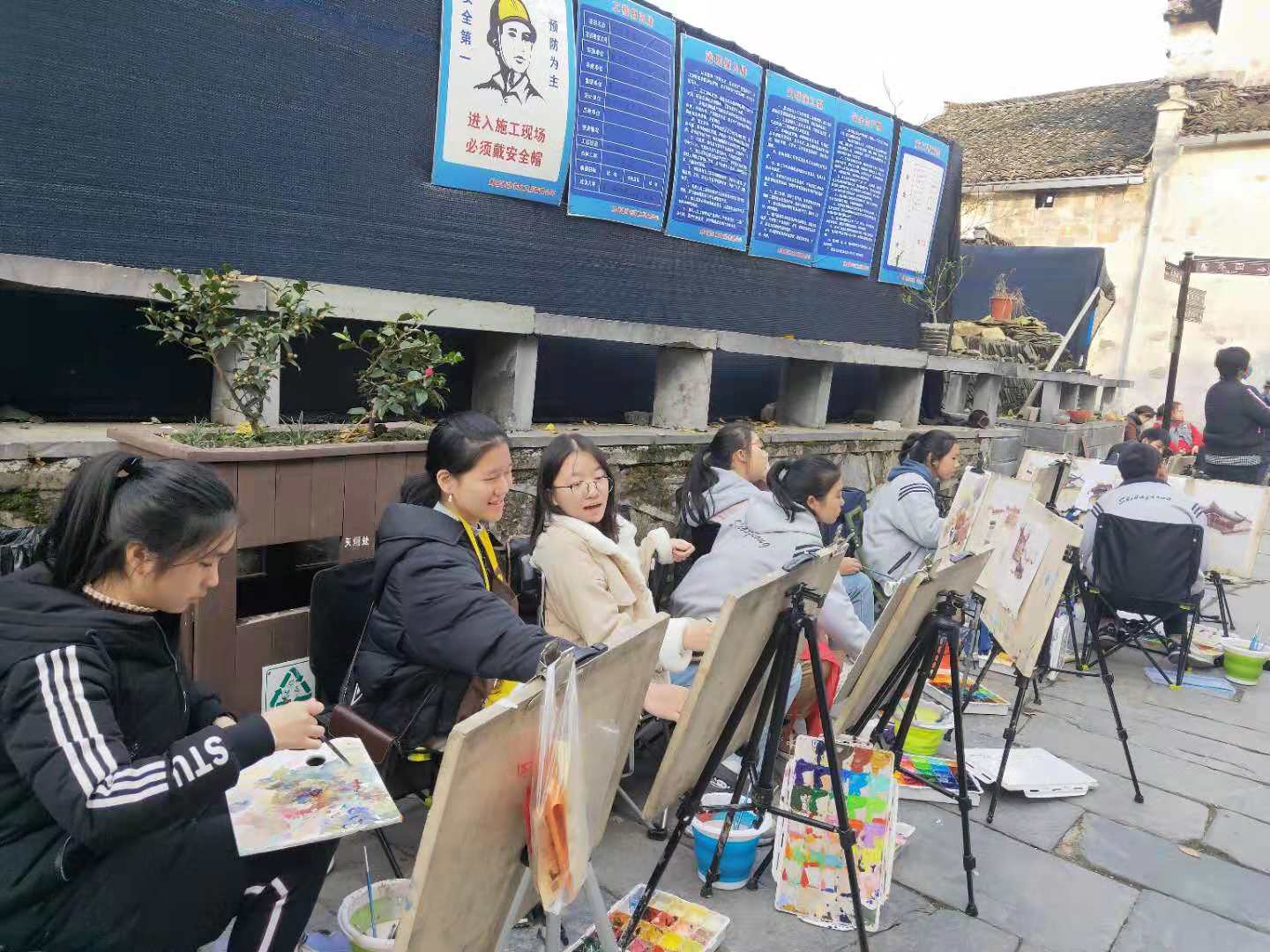 黄山的写生时间虽短暂,但是每一天都是充实而快乐的。学生们每天早上七点出发前往写生点,中饭由老师们负责送达,一直写生到下午回到基地,每晚再由美术老师们进行作业点评。每天的写生项目也不同,力争全面提高学生水平。