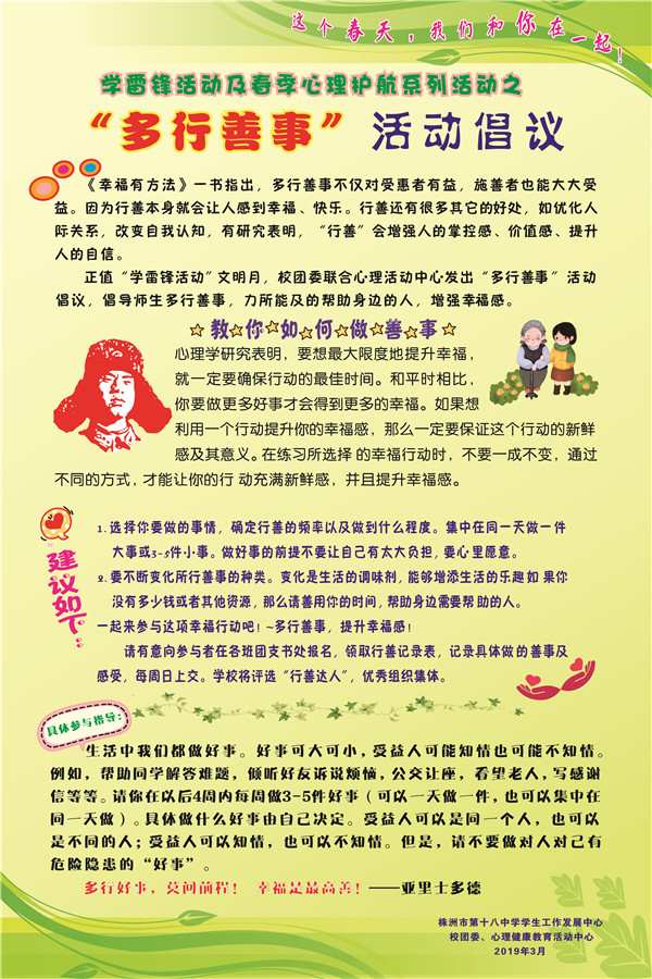 围绕主题,心理中心和朋辈心理辅导员一起设计了丰富多彩的心育活动,主要有1.春季“怡情健心”系列宣传;2.《共筑心灵防护墙》专题培训;3.情绪树洞VS解忧杂货店;4.“多行善事,提升幸福感”活动;5.高三绿色心理咨询;6.户外团体辅导活动等等。期待全体师生在活动中提升心育意识,关注心理,疏放情绪,收获心灵成长。