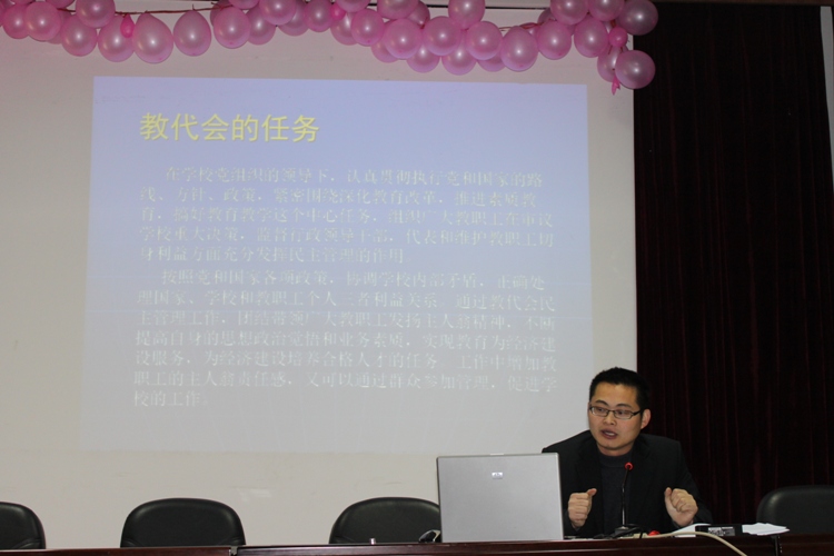彭主席用真切地话语谈了自己在新形势下对增强学校凝聚力的认识和思考;并用形象的例子层层递进地介绍了新时期教代会制度及职工代表应该如何发挥作用;最后彭主席语重心长地说:“教师是沙,领导是架,民主管理是凝固剂,要不就聚沙成塔,要不就一盘散沙。我们工会一定会将工会的作用发挥到淋漓尽致。”