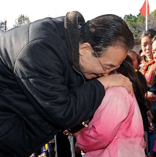 这是12月1日,温家宝来到昭觉县四开乡中心校红丝带栋梁班,看望父母因患艾滋病去世的41个孤儿,并同孩子深情拥抱,鼓励他们发奋努力,好好学习。新华社记者饶爱民摄