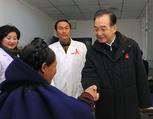在12月1日世界艾滋病日到来之际,中共中央政治局常委、国务院总理温家宝来到四川凉山彝族自治州考察艾滋病防治工作,看望广大彝族干部群众。他说,党和政府高度重视少数民族地区和贫困地区的艾滋病防治工作。我们必须坚持预防为主、防治结合、依法防治、科学防治,把艾滋病防治工作同促进经济社会发展结合起来,同扶贫、禁毒工作结合起来。