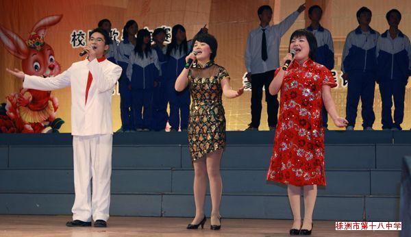 创建湖南省普通高中特色实验学校,将积淀多年的美术特色教育学校特色提升为全面建设美术教育特色学校,是十八中人多年来为之不懈努力的奋斗目标。2010年11月份,我校顺利通过了湖南省特色学校评估验收,省级特色实验学校挂牌指日可待!图片为教师代表在2011年元旦文艺汇演上的节目-配乐诗朗诵《十八中创特之歌》。